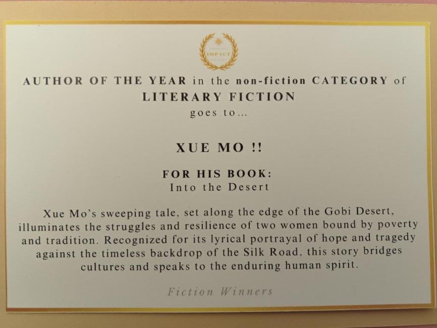(洛杉矶时间)2025年10月4日,中国作家雪漠的英文版作品《沙漠的女儿》(“Into the Desert”)由国际著名汉学家葛浩文和林丽君联合编译,荣获2025年“国际影响力年度作家奖”(INTERNATIOAL IMAPCT BOOK AWARDS -AUTHOR OF
