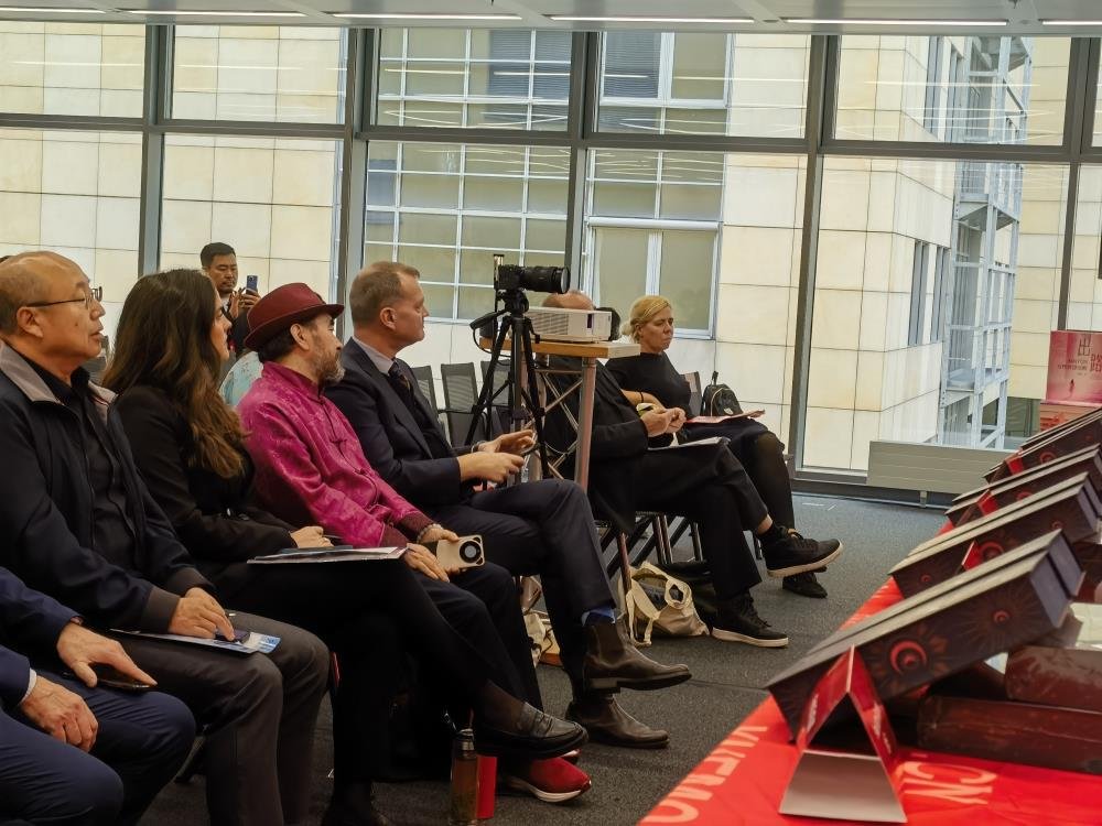 2025年10月15日下午(德国时间),由儒学国际传媒(Ruxue International Media Inc.)主办,新世界出版社和凯撒旅游(欧洲)协办的首届雪漠世界文学论坛在法兰克福书展举行。新世界出版社副总编辑朱芳女士;哈佛大学赫钦斯中心(Hutchins Center)研究员、前哈佛大学研究员、牛津大学访问研究员、马里兰大学荣休教授、歌德大学讲师托比•莱文(Tobe Levin)女士;波恩大学汉学家、历史学家、世界汉学大会理事会成员培高德(Cord EBERSPÄCHER)先生;挪威卑尔根大学中文项目创始教授、北欧汉学研究协会前主席赵守辉先生;获奖土耳其艺术家、米玛尔•希南美术大学教授、前副校长卡杰(CANER KARAVIT视频演讲)先生;丝绸之路研究专家、土耳其伊斯坦布尔海峡大学历史学博士樱桃(KIRAZ PERINCEK KARAVIT)女士;Clavis 出版社创始人、总裁菲利普•韦尔克(Philippe Werck)先生;法兰克福孔子学院德方执行院长、前同济大学中德工程学院副院长王魏萌(Christina Werum-Wang)女士;独立电影导演,制片人汉斯•卡尼克(Hannes Karnick)先生;Drachenhaus Verlag (龙屋)出版社社长傅愉(Nora Frisch)女士;国际知名学者、汉学家、同济大学外国语学院特聘教授莫冉 (Riccardo Moratto视频演讲)先生;中国国家一级作家,著名文化学者雪漠先生等,来自中国、英国、法国、德国、波黑、挪威、土耳其等国家的专家学者、翻译家、出版人、影视导演、文化界代表及海内外读者等,共同探讨雪漠作品的文学价值、跨越翻译交流、国际传播路径及跨文明对话意义。