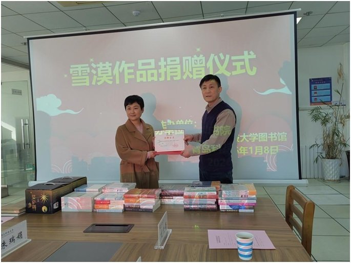 上午9时40分,捐赠仪式正式开始,由青岛科技大学图书馆副馆长张岩主持。青岛科技大学图书馆党委书记、馆长闫业海致欢迎辞,他对沂山书院的爱心之举表示诚挚感谢,并指出,优质图书的捐赠是对学校文化建设的有力支持,将为师生提供更丰富的阅读资源,助力汉语国际推广与中国文化传播。程剑女士在致辞环节,结合自身经历分享了阅读雪漠作品的感悟。她谈到,雪漠的文字不仅饱含深厚的文化底蕴,更蕴藏着启迪心灵的力量,自己在阅读过程中,收获了精神的成长与内心的丰盈,也愈发坚定了传播优秀文化、践行公益的决心。随后,沂山书院兰老师详细介绍了雪漠作品的创作特色与文化价值,让在场人员对这批图书有了更深入的了解。中国海洋大学退休教授王教授也受邀进行分享。仪式的核心环节,沂山书院向青岛科技大学图书馆捐赠134套共计178册雪漠作品集。程剑代表沂山书院递交捐赠图书清单,闫业海馆长代表学校接受捐赠,并向程剑颁发捐赠证书,双方合影留念,定格下这一意义非凡的时刻。闫业海馆长在总结讲话中强调,图书馆将妥善保管、高效利用这批图书,让雪漠作品中的文化智慧惠及更多师生,推动校园形成爱读书、读好书、善读书的浓厚氛围。