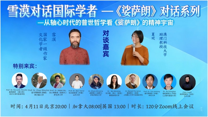 4月11日,由世界文学联合会、雪漠基金会主办的“雪漠对话国际学者论坛”第四期线上会议成功举行。本次论坛的主题为“唤醒轴心时代的普世哲学——《娑萨朗》的精神宇宙”,由澳门科技大学助理教授夏欢博士担任主旨报告人,与著名作家雪漠及来自全球的多位学者、嘉宾展开深度对话。