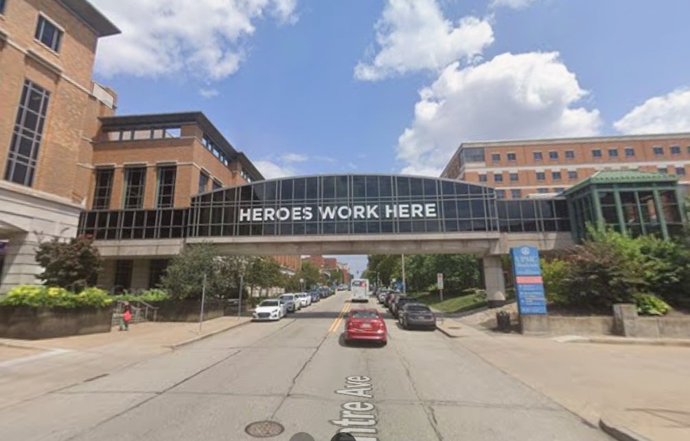在路边歇脚的时候,我抬头打量了这栋大楼。外观其实很普通,只有五六层高,浅棕色的外墙在匹兹堡随处可见,和大学里的教学楼或者科研楼差不多。真正醒目的是它和对面大楼之间那道玻璃廊桥上,用巨大的白色字母写着“HEROES WORK HERE”——英雄在这里工作。