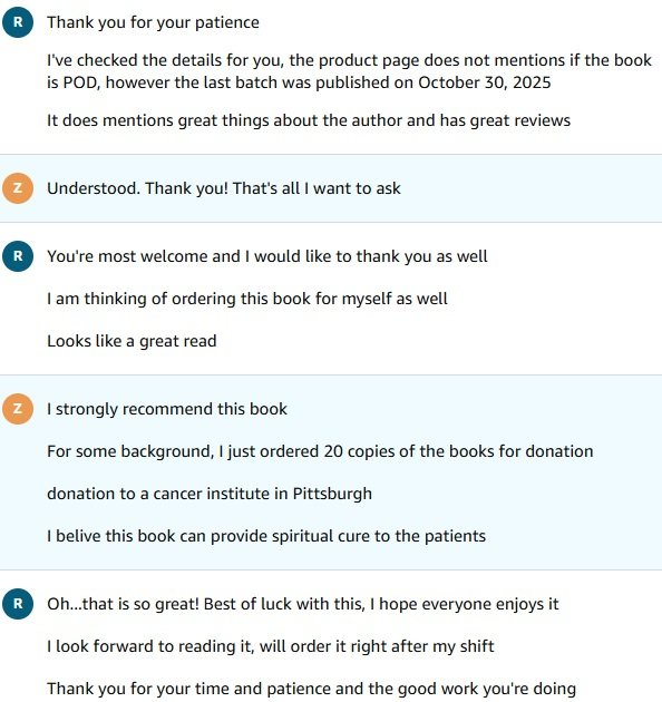 聊到最后,我随口问了个“纯好奇”的问题:“以后怎么从商品页面一眼看出这本书是按需印刷还是仓库现货发货?”他查询了一阵回复说:书籍销售页面上没有显示按需印刷的标识。本来以为对话要结束了,他突然又补了一句:“我也在考虑也给自己买一本,看上去是本很棒的书!”我一听,灵机一动赶紧接话:“我十分推荐这本书!而且我这次订购了20本是为了捐赠给匹兹堡的一个癌症机构,我相信这本书能给他们带来精神上的疗愈。”客服小哥听完说“that's so great!”,告诉我他下班后就去买,祝我一切顺利,还感谢我做这么有意义的事。