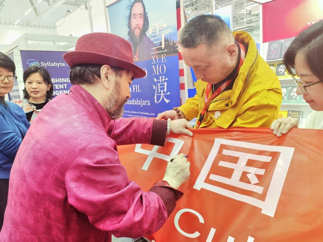 雪漠作品首次亮相2025瓜达拉哈拉国际书展,获西语世界读者的喜爱。《世界是心的倒影》《雪漠诗说老子》(西语版)以及中文版动物小说系列、散文随笔等数百册图书,在四天内全部售罄。读者纷纷在书页上写下祝福,表达对作品的喜爱。