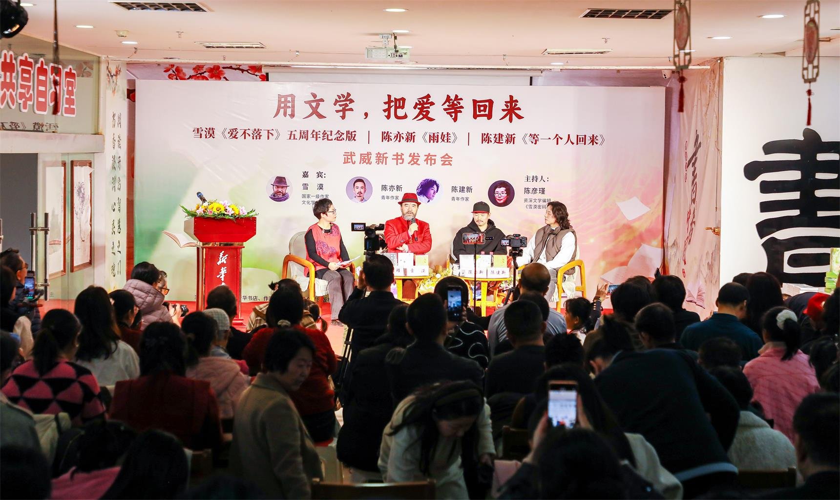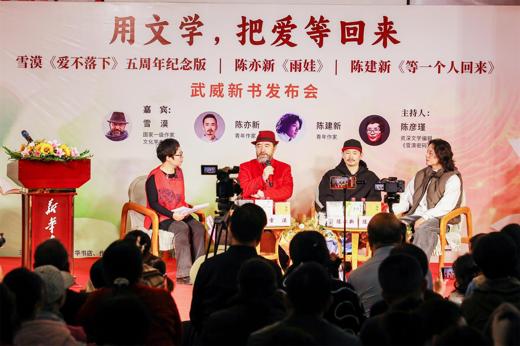 2026年3月1日上午,武威新华书店内暖意融融、书香氤氲,由武威新华书店、作家出版社、人民文学出版社联合举办的《爱不落下》(五周年纪念版)、《雨娃》《等一个人回来》新书发布会在此隆重举行。著名作家雪漠携青年作家陈亦新、陈建新返乡赴会,围绕“文学归乡、爱与救赎”的核心主题,展开了一场兼具温度与深度的文学对谈。本次活动由人民文学出版社资深文学编辑、《雪漠密码》作者陈彦瑾女士主持,众多读者、文学爱好者齐聚一堂,共赴这场跨越两代人的文学之约,在文字中感受故乡的力量与大爱的温度。