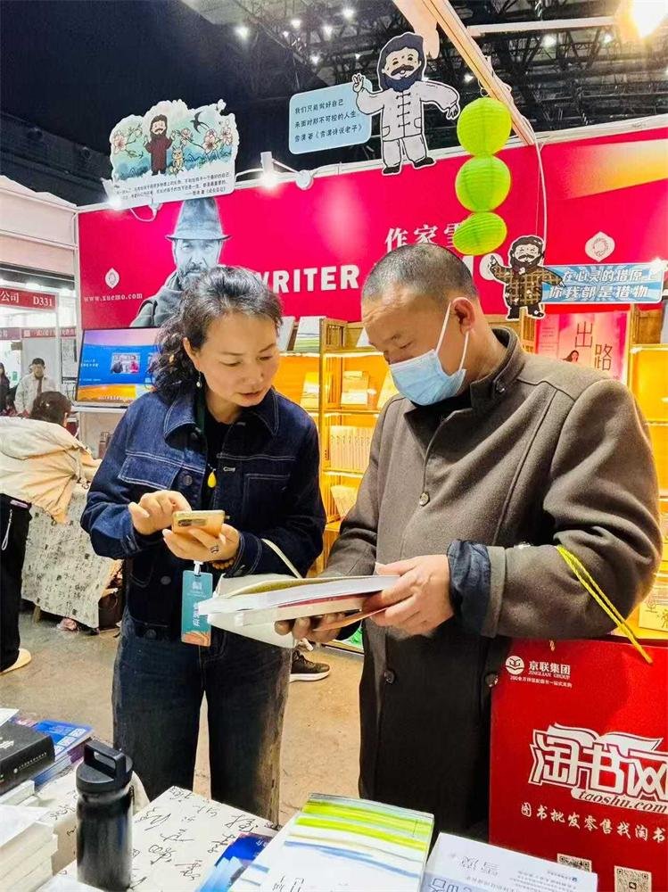这次书展,有两个引流特别给力的男老师,他们是来自湖南的余磊和陈海洋两位老师。余磊是一名老师,几年前就带领全班学生共读雪漠老师的作品。他说班上已有几位“硬核雪粉”崭露头角。展会进行到第二天,余磊一来展位,二话没说就拿上书签去各个点派发。他像巡视员一样在各个展位前跟不同的书商宣传我们的展位。有一个老板最开始漠然地说:“我没时间看书,也没闲钱买书。”第三天,余磊又拿着牌子前去“兜售”,这位书商依旧没动心。快拆展的时候,这位书商看到余磊热情不减,同时也被我们展位的志愿者感动了,他主动走进了展位。当我为他介绍的时候,他频频点头,就像一名听话的小学生。随后他挑选了不少书,还跟我们合影留念。